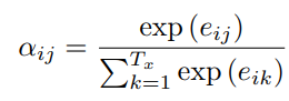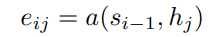 i ๋ฒ์งธ ๋จ์ด๋ฅผ ์์ธกํ ๋ ์ฐ์ด๋ ํ๋ ์คํ ์ดํธ s ์ Encoder์ j ๋ฒ์งธ ์ด ๋ฒกํฐ h๊ฐ ์ผ๋ง๋ ์ ์ฌํ์ง ๋ํ๋ด๋ ์ค์นผ๋ผ๋ฅผ ๊ณ์ฐํ๋ค. a ๋ alignment model ์ ์ฌ๋๋ฅผ ์ ๋ฝ์๋ด๋ ํจ์๋ฉด ์ด๋ค ๊ฒ์ด๋ ๊ฐ๋ฅํ๋ค.