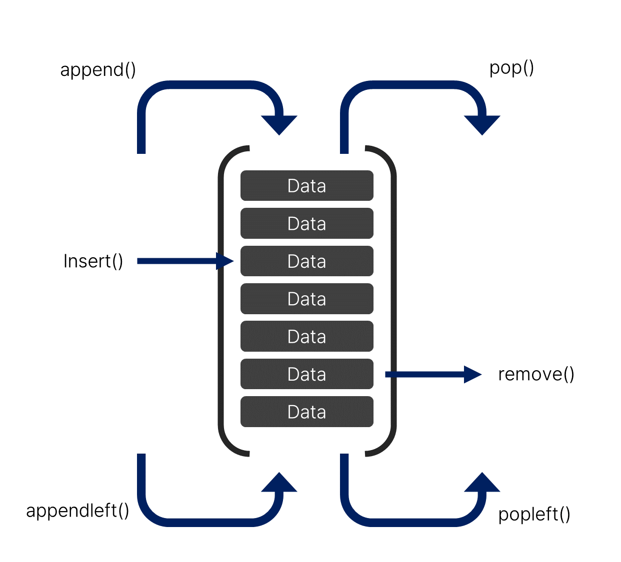 스택과 큐 연산을 모두 지원하기에, 양 끝에서 삽입과 삭제가 가능한 자료구조입니다. 내부가 double-linked list(양방향 연결 리스트)로 구현되어 있습니다.