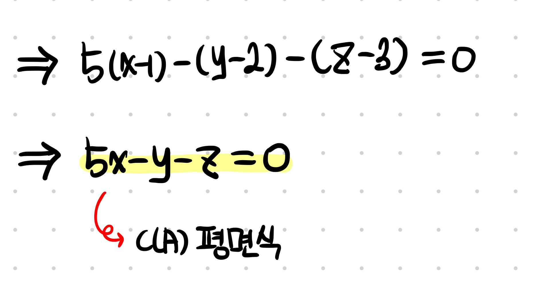 잘 정리하면, x, y, z로 구성된 이쁜 평면식을 구해낼 수 있습니다.