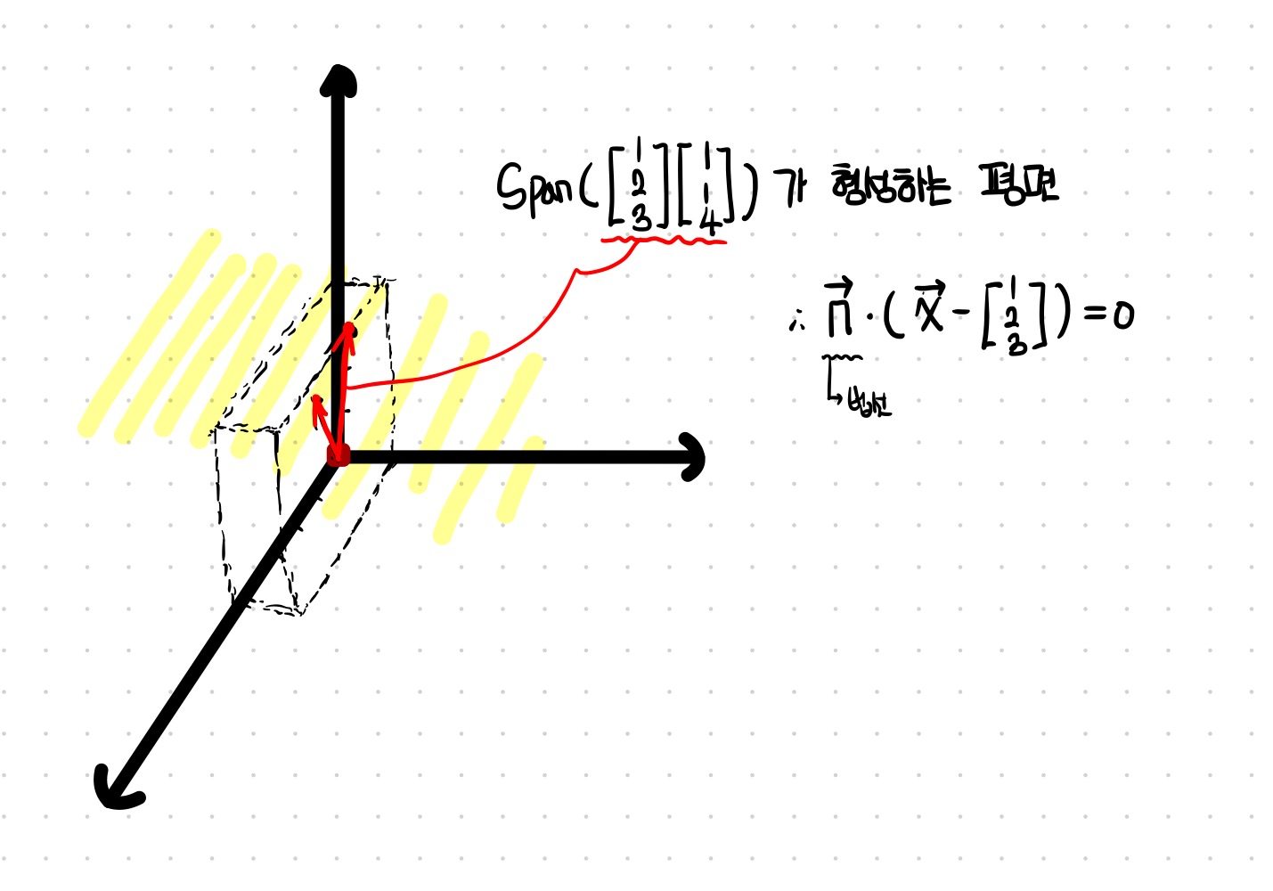 다음과 같이 3차원 그래프에 표현할 수 있습니다. 이 둘의 벡터로 나타낼 수 있는 모든 벡터의 집합은 하나의 평면(노란 형광 영역)을 나타낼 것입니다. 평면식은 어떻게 구할 수 있을까요? 법선벡터와 평면위의 벡터를 내적하면 0이 나온다는 것을 이용하면 구할 수 있습니다.