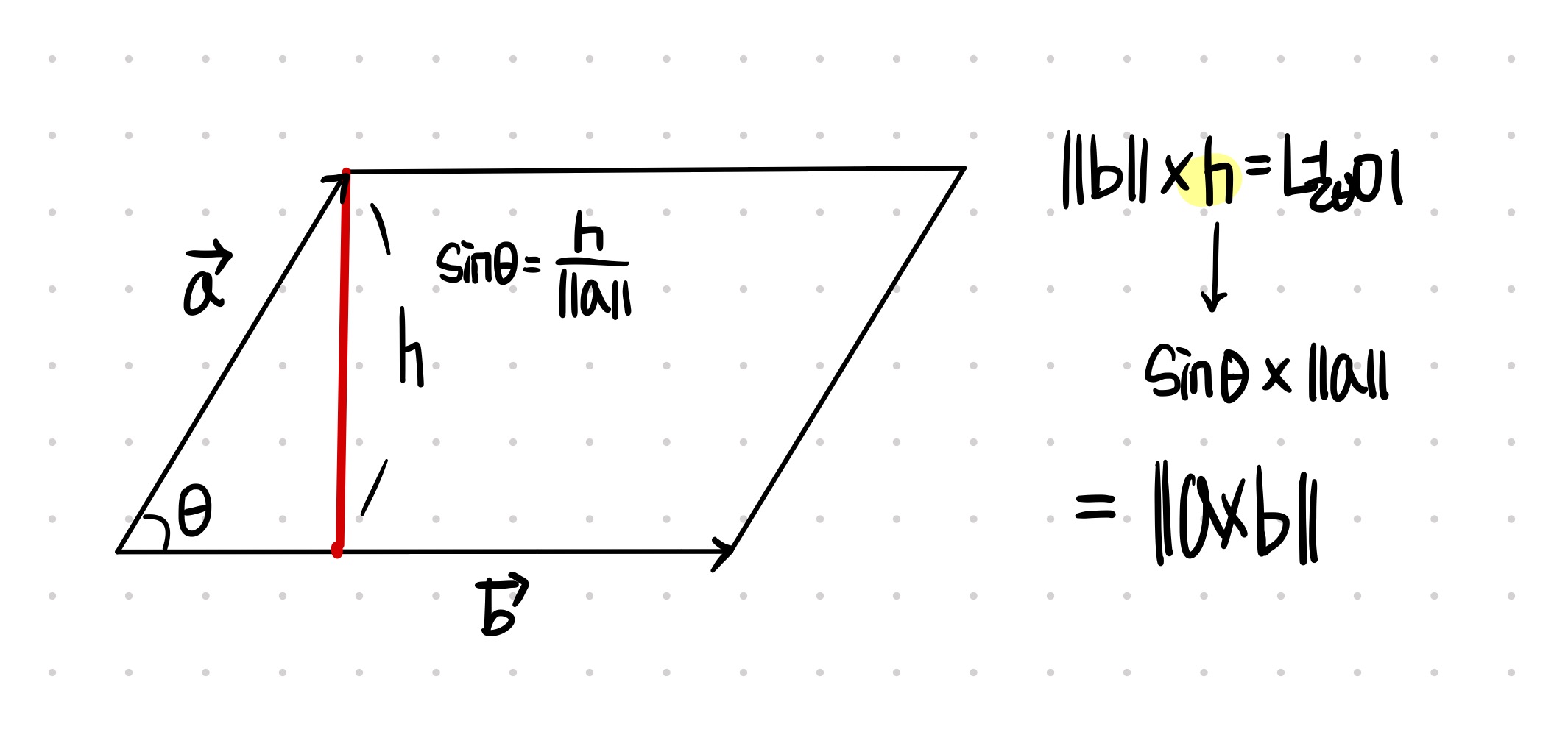 a, b의 외적한 벡터의 길이는 다음 수식을 따른다.
