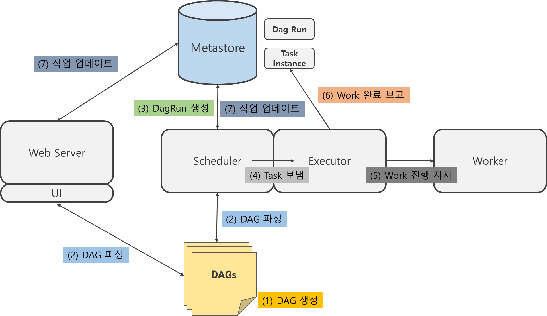 Scheduler, Executor, Worker, Web Server, Metastore, Dags ๋ฑ์ด ๊ตฌ์ฑ์์์ ๋๋ค.