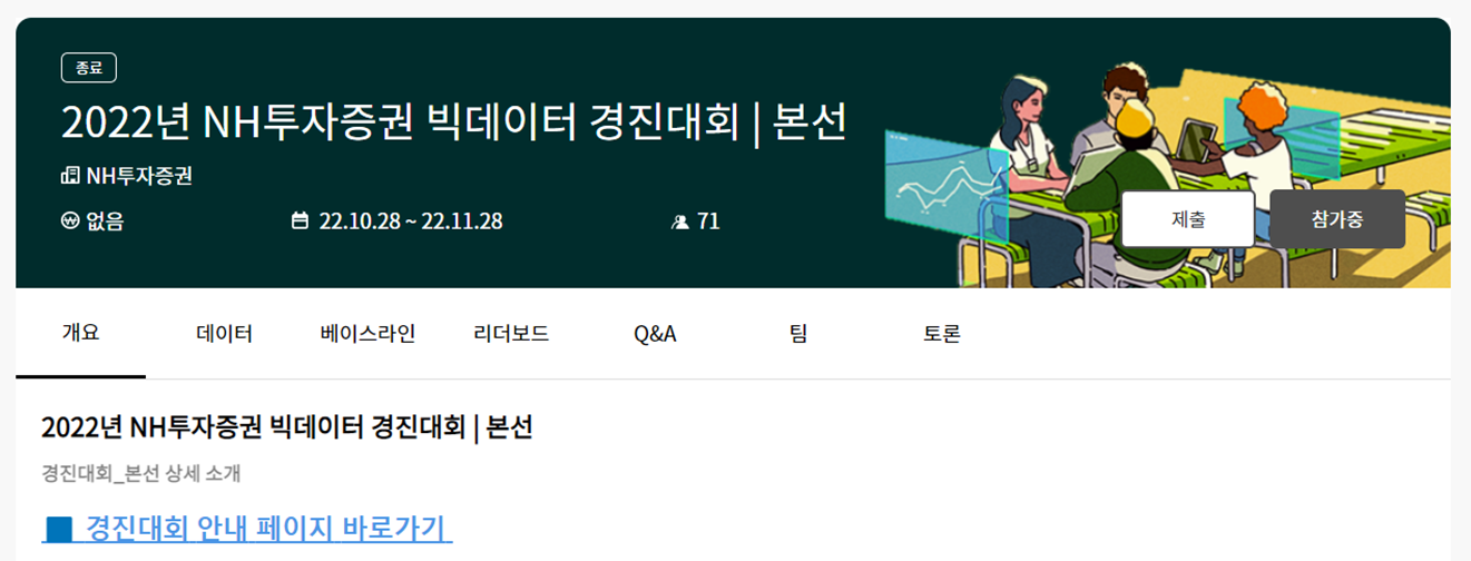 NHํฌ์์ฆ๊ถ ๋น ๋ฐ์ดํฐ ๊ฒฝ์ง๋ํ์ ์ฐธ์ฌํ ์ง ์ด๋๋ง 1๋ฌ.