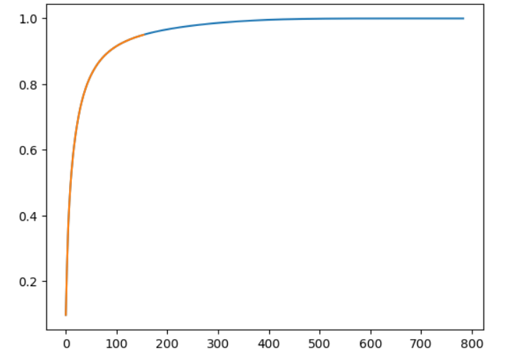๊ทธ์ ๋ฐํด, cumsum_reduced๋ n_components 95% ์ ํ์ด ์กด์ฌํ๋ค. ์ฝ 150์ฐจ์์์ ์กฐ๊ธฐ ์ข ๋ฃํ ๊ฒ์ ๋ณผ ์ ์๋ค.