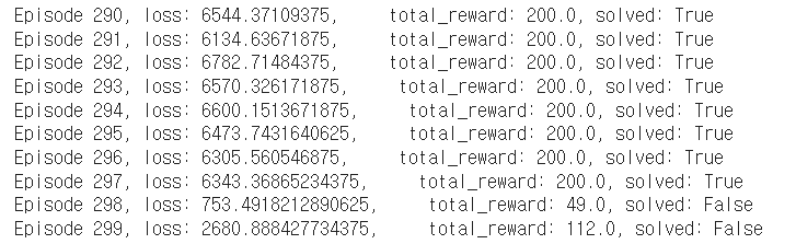 episode(=epoch)๋ 300๋ฒ์ด๋ค. ๋งค episode๋ง๋ค state๋ ์ด๊ธฐํ๋๊ณ , timeste 200๋ฒ์ ๋ ๋๊น์ง ์คํจํ์ง ์์๋ค๋ฉด ์ฑ๊ณต์ผ๋ก ๊ฐ์ฃผํ๋ค. ๋งค timestep๋ง๋ค ((\pi)) ์ ๊ฒฝ๋ง์ ํตํด action์ sample ํ๋ฉฐ, ์ด์ ๋ฐ๋ฅธ ๋ค์ state, reward๋ฅผ ๊ตฌํ์ฌ ์ ์ฅํด ๋๋ค.