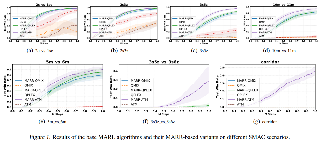 SMAC(์คํํฌ๋ํํธ) ํ๊ฒฝ์์ ์ ๋ช ํ ๋ชจ๋ธ๋ก๋ QMIX, QPLEX, ATM ๋ฑ์ด ์๋ค. ์ด ๋ชจ๋ธ์ ๋ํ์ฌ MARR์ ์ ์ฉํ์ ๋, ์ฑ๋ฅ์ด ์ด๋ป๊ฒ ํฅ์๋์๋์ง ๋น๊ตํ๋ ์คํ์ ์งํํ์๋ค. ์คํ ๊ฒฐ๊ณผ, ๋ชจ๋ ์๋๋ฆฌ์ค์์ MARR์ ์ ์ฉํ ๋ชจ๋ธ์ด ์ฐ์ํ ์ฑ๋ฅ์ ๋ณด์ด๋ ๊ฒ์ ์ ์ ์๋ค.