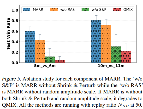 ๋ ๋ฒ์งธ Ablation Study๋ก MARR์ replay ratio๋ณ ์ฑ๋ฅ ํ์ธ์ด๋ค. ๋ ์๋๋ฆฌ์ค์์ ๋จ์ Series, Parallel๋ณด๋ค ๋์ ์ฑ๋ฅ์ ๋ณด์ด์ง๋ง, ๋ง์ฐฌ๊ฐ์ง๋ก ์ต์ Replay ratio๊ฐ ์กด์ฌํ๋ฉฐ, ์ด๋ ๋ค๋ฅธ ๋ ๋ชจ๋ธ๋ณด๋ค ๊ฐ์ด ๋์๋ค.