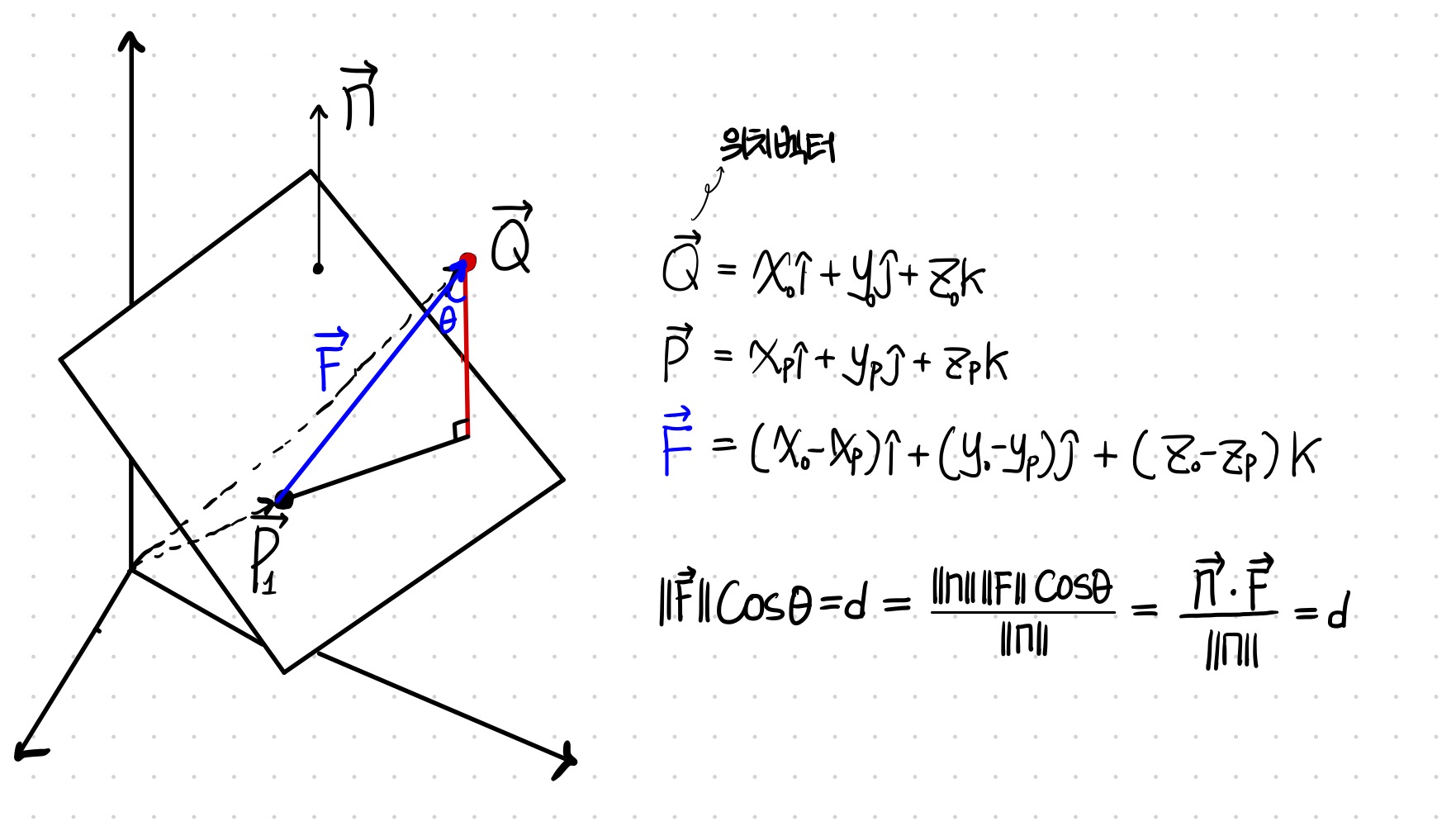 벡터 Q, 벡터 P는 위치 벡터다. Q는 점을 가리키며, P는 평면 위의 점 하나를 가리키고 있다.