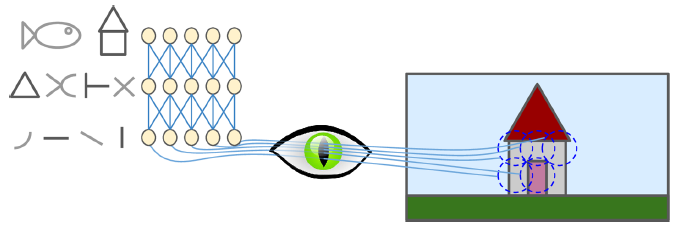 ์ ๊ทธ๋ฆผ์ ์ค์ ์๊ฐํผ์ง์ ๋ด๋ฐ์ด ์๋ํ๋ ๋ฐฉ์์ด๋ค. ์ธ๊ฐ์ ๋์ ์ฌ๋ฌผ์ ํ ๋ฒ์ ๋ฐ์๋ค์ฌ ์ธ์ํ๋ ๊ฒ์ด ์๋๋ค. ์ฌ๋ฌผ์ด ์ชผ๊ฐ์ ธ์ ์ ๋ ฅ๋๊ณ , ์ด๊ฒ๋ค์ด ๋ด๋ฐ ์ฐ๊ฒฐ๋ค์ ๊ฑฐ์ณ ํ๋์ ์ด๋ฏธ์ง๋ก ์ธ์๋๋ค. ๊ตญ๋ถ ์์ฉ์ฅ์ด๋ผ๋ ๋ถ๋ถ(๋๊ทธ๋ผ๋ฏธ)๋ค์ด ๋ด๋ฐ์ ์ ๋ ฅ๋๊ณ , ์ด ์ ๋ ฅ๊ฐ๋ค์ด ๋ค์ ๊น๊ฒ ์ฐ๊ฒฐ๋๋ฉฐ ๋ณต์กํ ํจํด์ ๊ฐ๋ค์ ๋์ถํ๋ค.