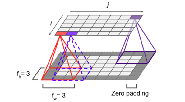 ์๋ฅผ ๋ค์ด, 3x3 ๋ฒ์๋ฅผ ํ๋์ ๋ด๋ฐ์ด ์ธ์ํ๋ค๊ณ ํ์. ๋นจ๊ฐ์ ์ฌ๊ฐํ์ ํฝ์ ๊ฐ์ ์ฒซ ๋ด๋ฐ์ด ์ธ์ํด์ ๊ฐ์ ธ๊ฐ๊ณ , ๊ทธ๋ค์ ๋ด๋ฐ์ ํ๋์ ์ฌ๊ฐํ์ ํฝ์ ๊ฐ๋ค์ ์ธ์ํด์ ์ ๋ ฅ๊ฐ์ผ๋ก ๊ฐ์ ธ๊ฐ๋ค.