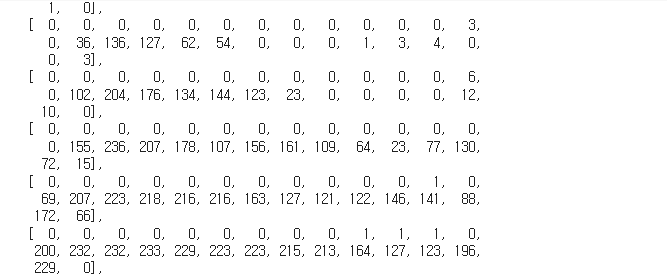 28x28 ํฌ๊ธฐ์ด๋ฉฐ, 0~255๊น์ง์ ๊ฐ์ด ๋ถํฌํด์๋ค.
