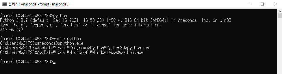 Anaconda prompt๋ฅผ ์ด์ด์ python ์์น๋ฅผ ํ์ธํ๋ค.