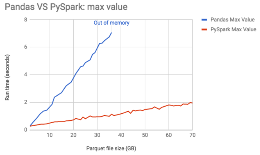 ํ์ง๋ง ์์ ๋ฐ์ดํฐ์์ ํ๋ค์ค๋ณด๋ค Spark๊ฐ ์ฒ๋ฆฌ ์๋๊ฐ ๋๋ฆฌ๋ค. ์ด๋ Spark๊ฐ ํ์ฅ์ฑ์ ๊ณ ๋ คํด์ ์ค๊ณํ๊ธฐ ๋๋ฌธ์ด๋ค. ๋ฐ์ดํฐ ํฌ๊ธฐ๊ฐ ์ฆ๊ฐํ ์๋ก Pandas์ ์ฒ๋ฆฌ์๋๋ O(n) ๋๋์ผ๋ก ์ฆ๊ฐํ์ง๋ง, Spark๋ ๊ทธ๋ ์ง ์๋ค.