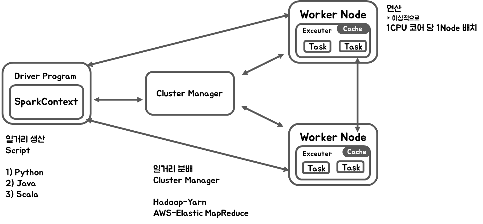 Apache Spark๋ ๋น ๋ฐ์ดํฐ ์ฒ๋ฆฌ๋ฅผ ์ํ ์คํ์์ค ์์ง(๊ณ ์ ๋ถ์ฐ์ฒ๋ฆฌ)์ด๋ค.
