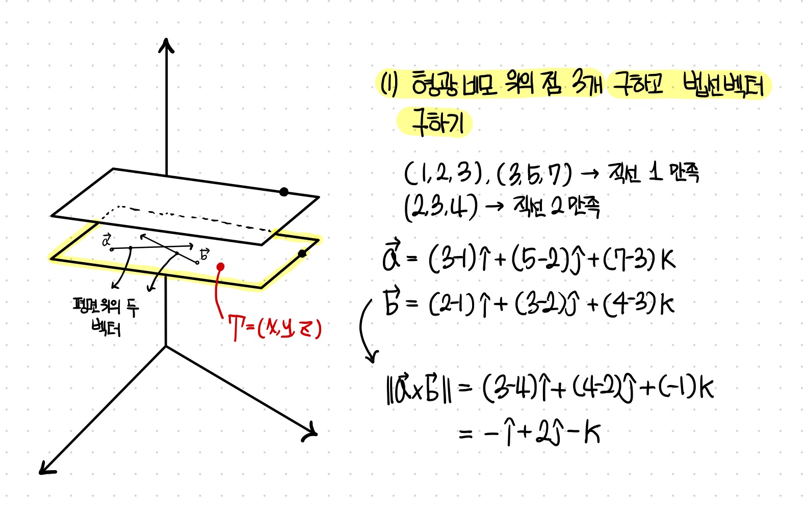 벡터 a와 벡터 b를 곱한 이유도 수직 벡터, 즉 법선 벡터를 얻기 위함이다.