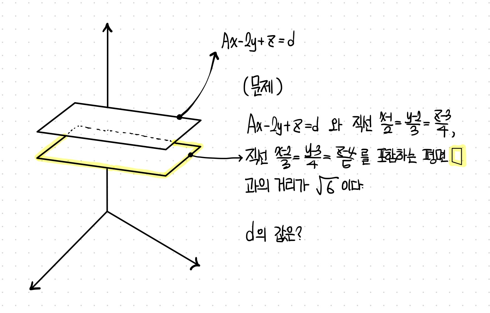 하지만 해당 문제에선 B평면의 방정식 일부만 나왔고, A평면 위의 직선 두 개만 제시되었다.