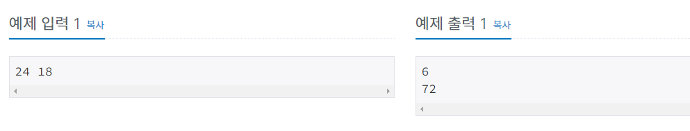 첫째 줄에는 입력으로 주어진 두 수의 최대공약수를, 둘째 줄에는 입력으로 주어진 두 수의 최소 공배수를 출력한다.