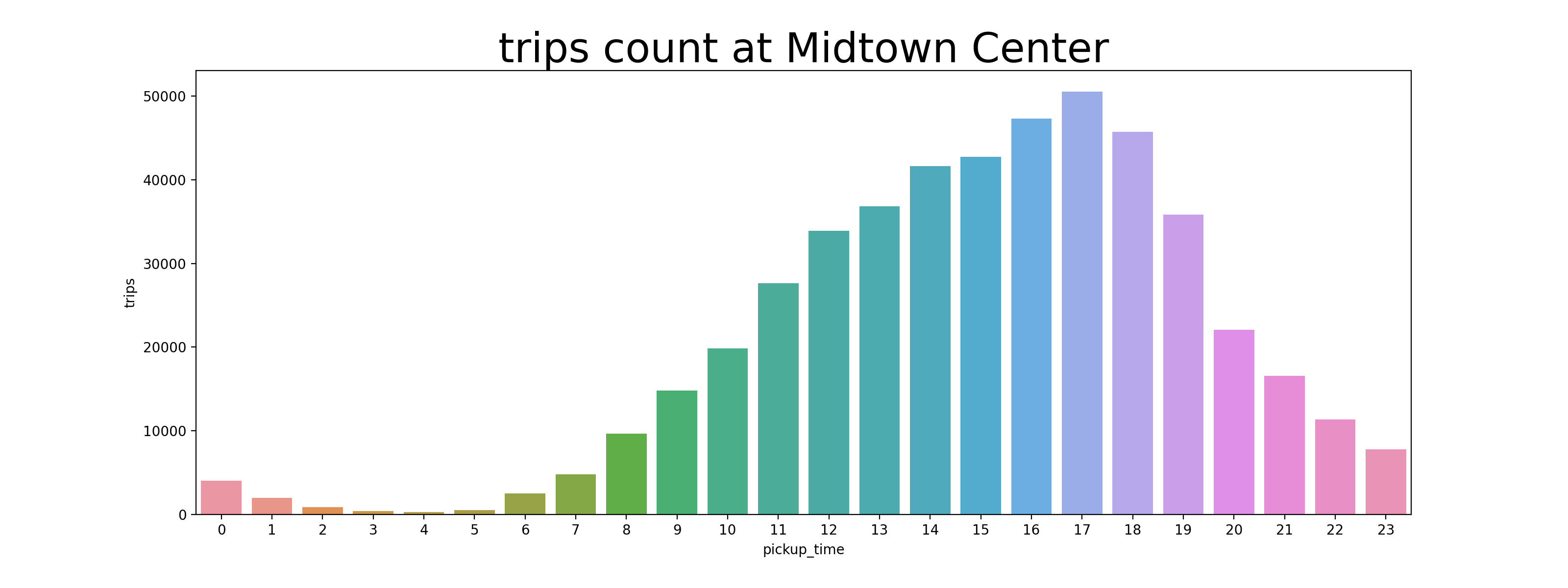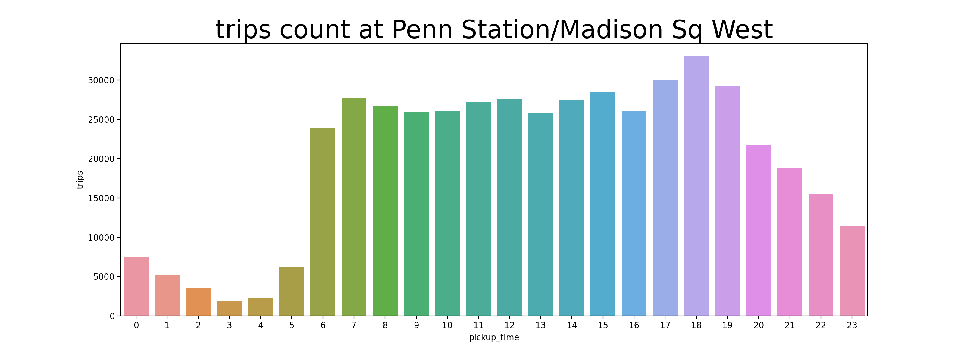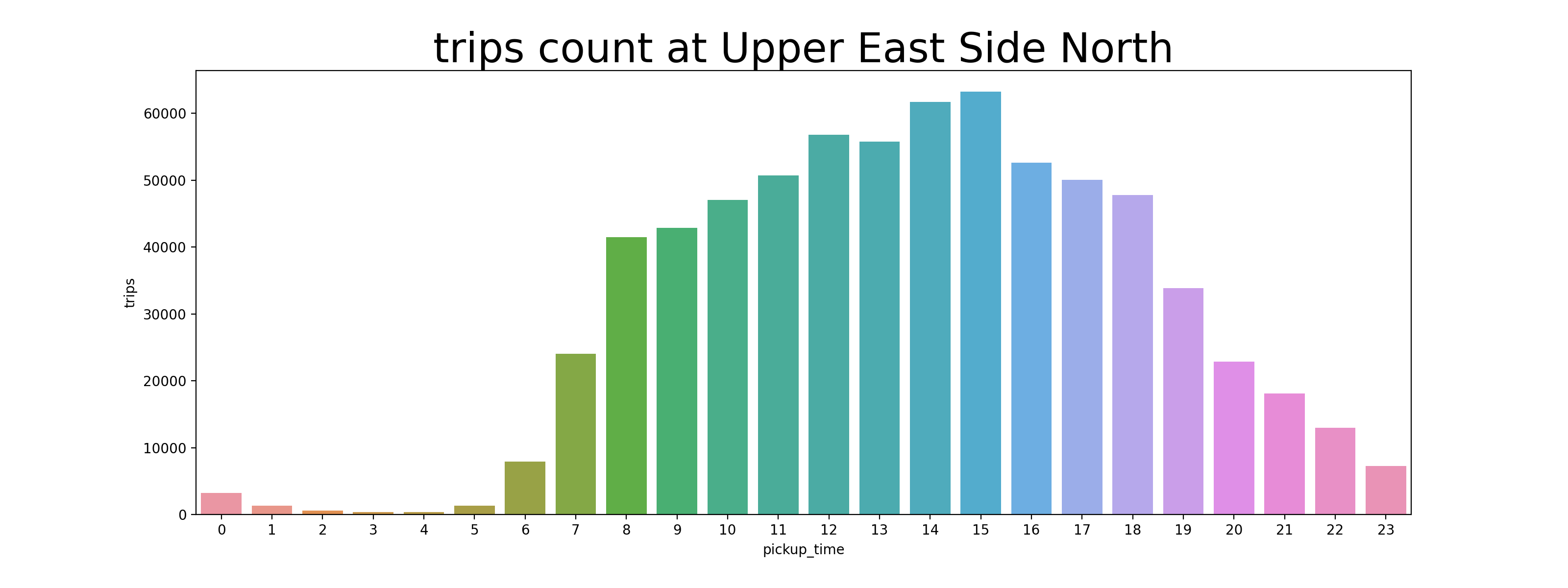 Trips ๋น๋๋ 6์๋ถํฐ ๊ณ์ํด์ ์ฌ๋ผ๊ฐ๋ค๊ฐ 18์์ Peak๋ฅผ ์ฐ๊ณ ๋ด๋ ค๊ฐ๋ค. 14์-18์ ์ฌ์ด์๋ ๋ฌด์กฐ๊ฑด ์ด์ ๋๋ฅผ ์ก๊ณ ์์ด์ผ ํ๋ค๋ ๊ฒฐ๋ก ์ด ๋์จ๋ค. ๋ง์ฝ Top 5 ์ฅ์๋ค์ด ๊ฐ๊ฐ ๋ค๋ฅธ ์๊ฐ๋ ํน์ฑ์ ๊ฐ์ง๊ณ ์๋ค๋ฉด ์ด๋จ๊น? Upper East Side๋ ์์นจ์ Peak๋ฅผ ์ฐ๊ณ , Penn Station์ ์ ๋ ์ Peak๋ฅผ ์ฐ๋๋ค๋ฉด, ๋น์ ์ ์์นจ์ Upper East Side๋ก ์ถ๊ทผํ๊ณ Penn Station์์ ํด๊ทผํ๋ฉด ๋ ๊ฒ์ด๋ค.