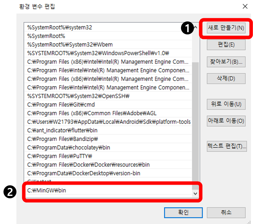 새로 만들기를 클릭하여 MinGW\bin의 파일 경로를 등록해줍니다.