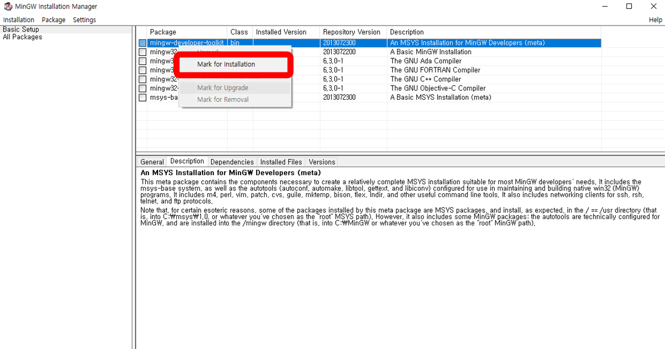 오른쪽 마우스를 이용해서 Mark for Installation을 클릭하면 체크 표시된다.