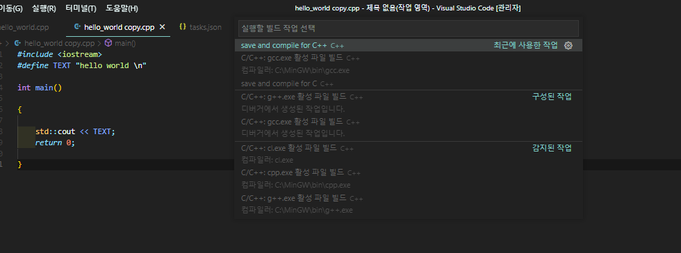 -> save and compile for C++ C++ 클릭해주면, 해당 파일이 컴파일되면서 exe 파일이 만들어집니다.