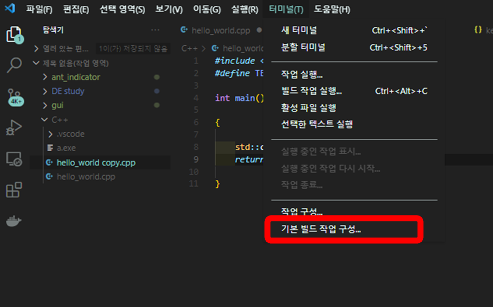 [터미널] - [기본 빌드 작업 구성] 클릭