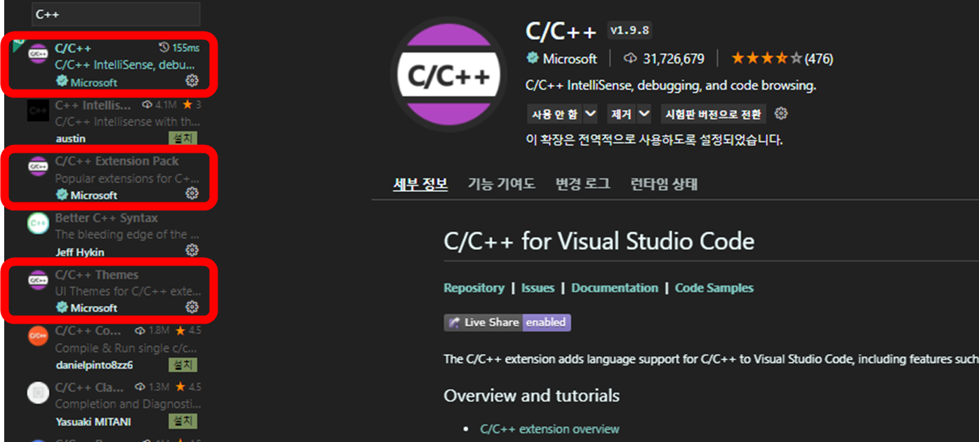 C++ 확장 패키지들을 설치해줍니다.