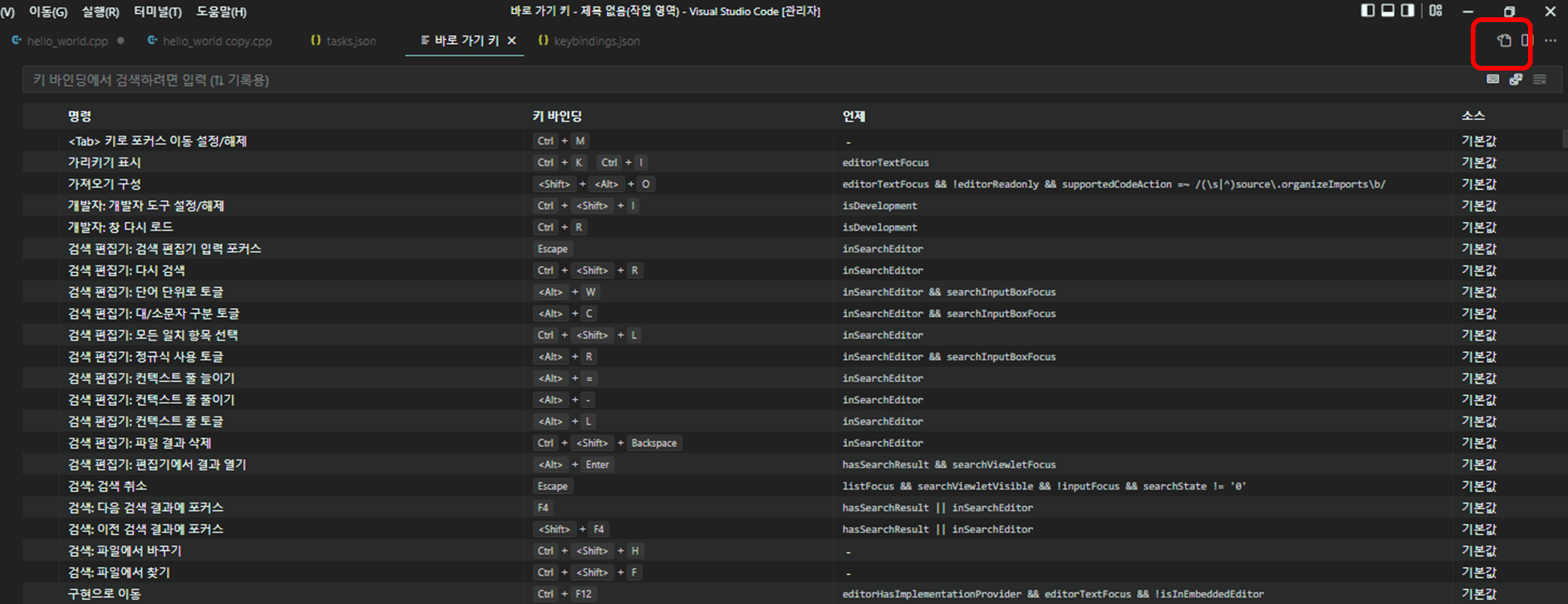 이렇게 단축키 리스트가 뜨는데, 가장 오른쪽의 빨간색 네모 안에 있는 아이콘을 클릭합니다.
