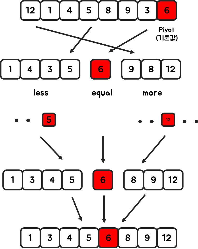 => 기준 값(pivot)을 기준으로 less, equal, more 리스트로 나눈다.