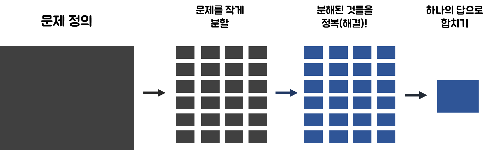 한 번에 해결하기 어려운 문제(시간문제, 공간문제 등)를 잘게 쪼개고 각개 격파한 후, 하나의 답을 도출하는 알고리즘.