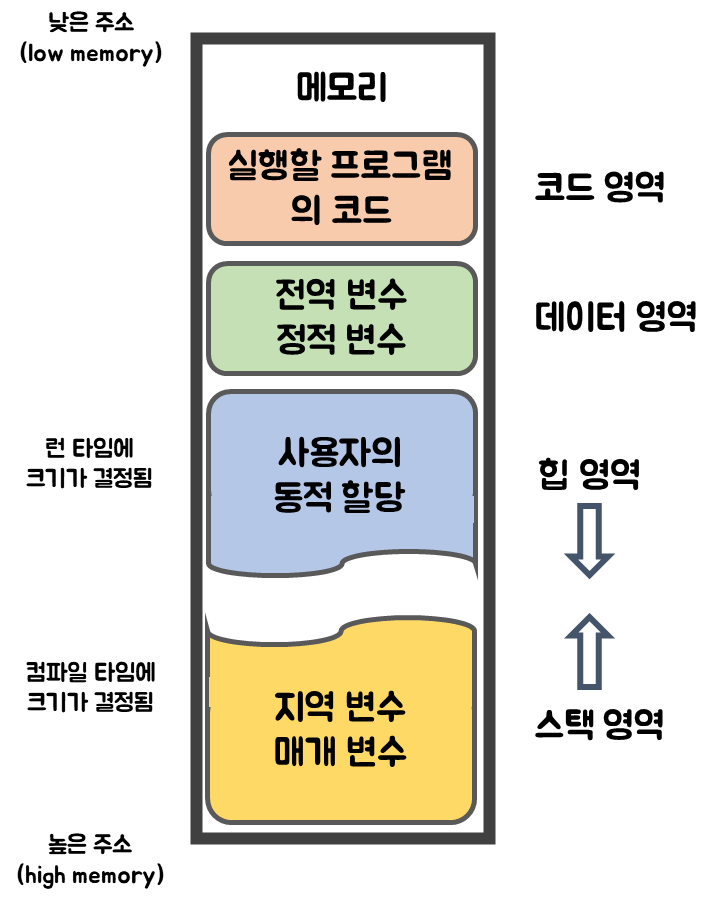 데이터, 스택 영역에서 할당되는 메모리의 크기는 컴파일에 결정됩니다. 하지만 힙 영역의 크기는 런 타임에 사용자가 직접 결정합니다. 런 타임에 사용자가 직접 메모리를 할당받는 것을 메모리의 동적 할당이라고 합니다. 메모리 동적 할당은 힙 영역에서 이뤄집니다.