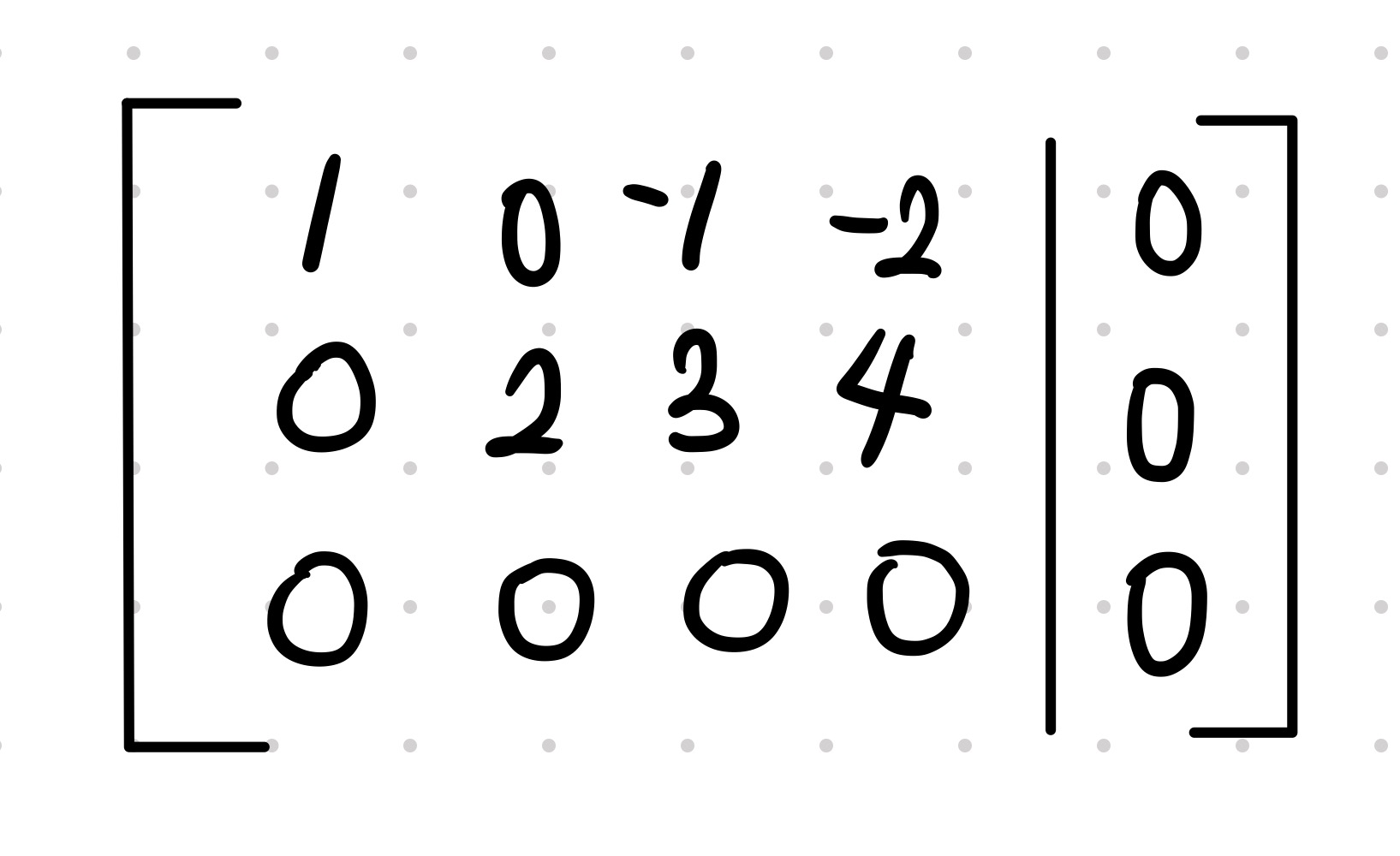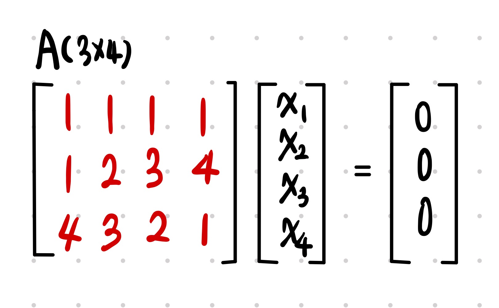 행렬 A가 있습니다. 3행 4 열이며, 벡터 x와 곱해지면 0 벡터가 된다는 것이 밑의 그림입니다.