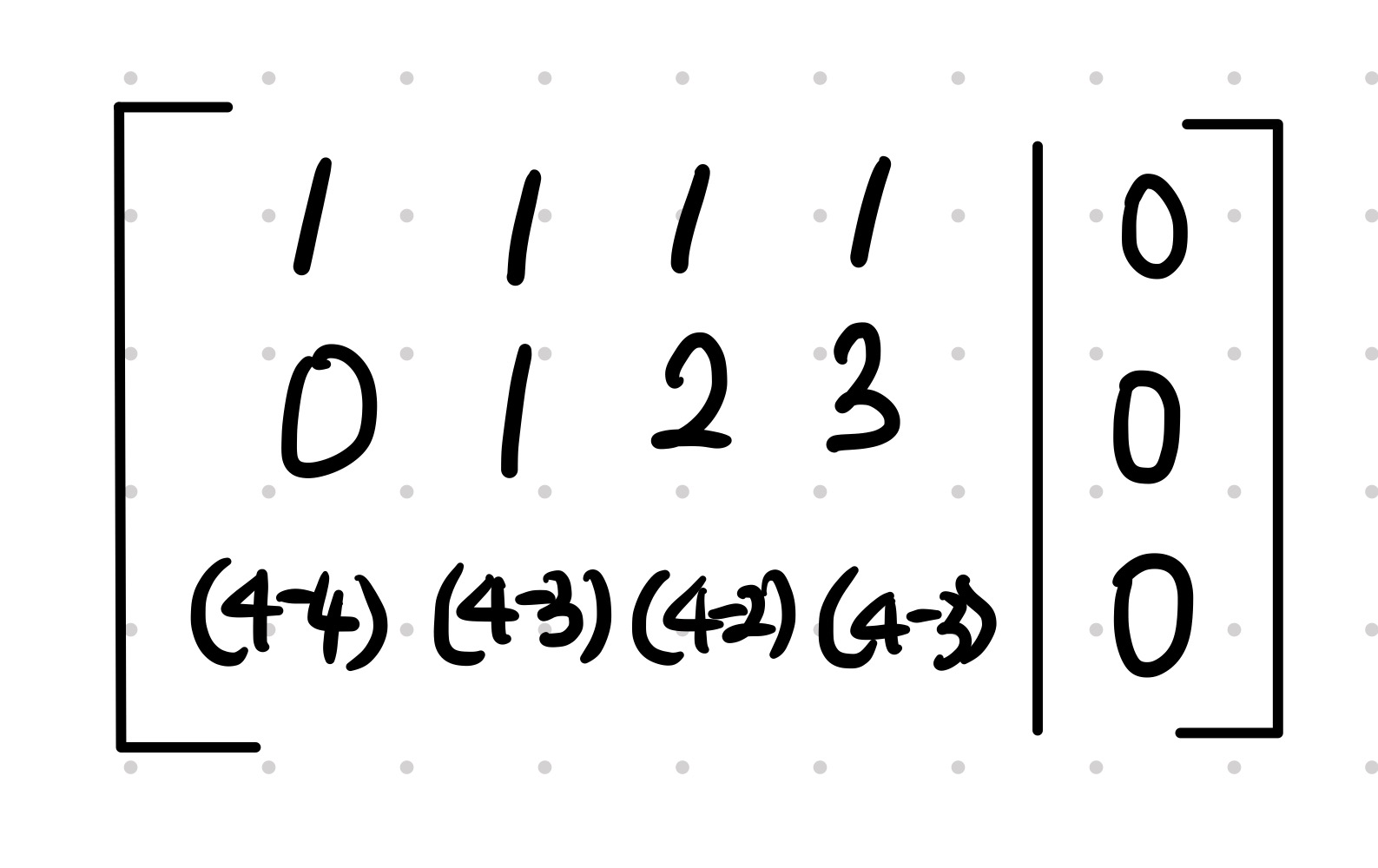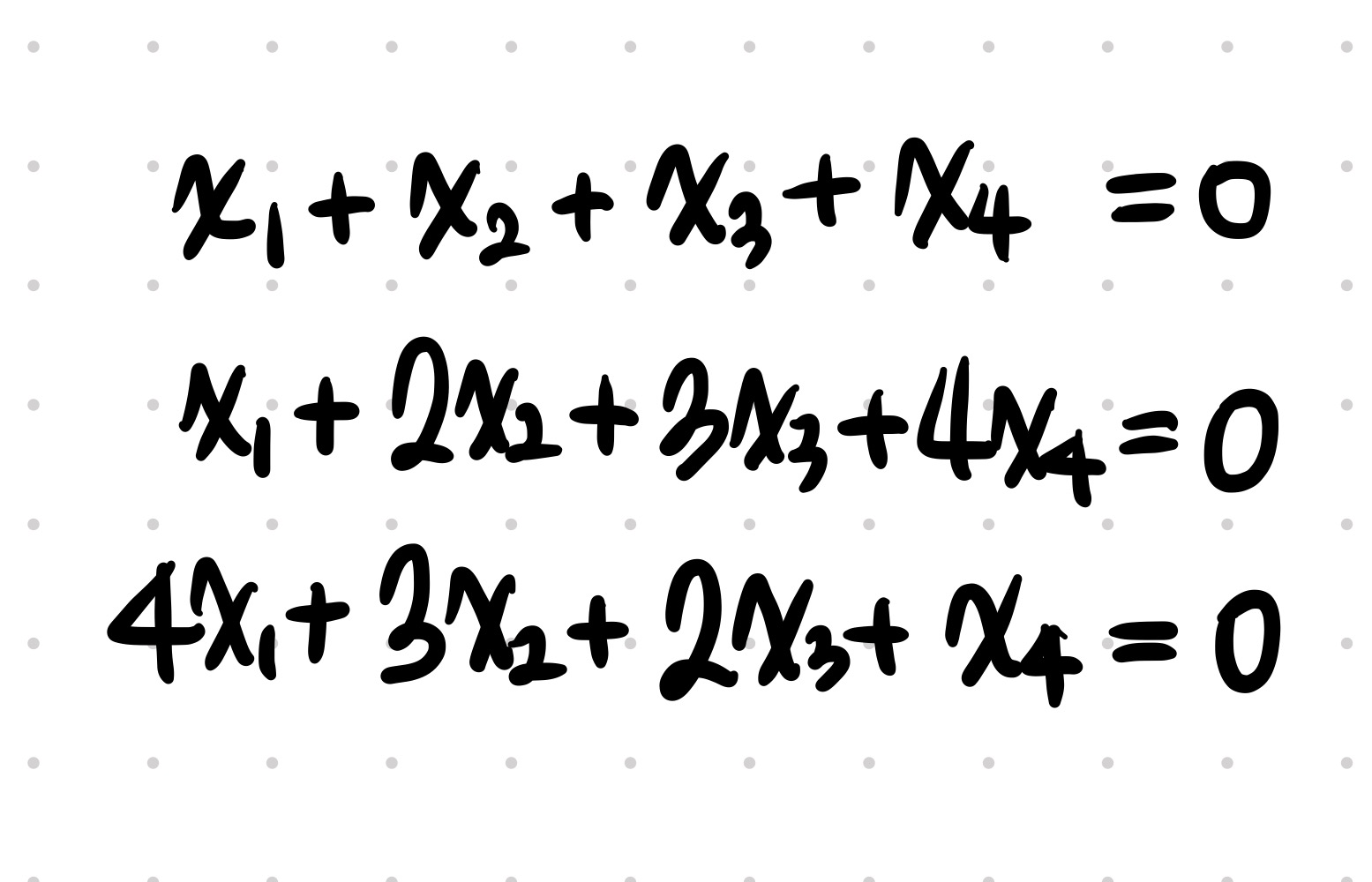 즉, 곱 결과 = 0이며 이를 만족하는 x1, x2, x3, x4를 찾으면 영공간을 찾을 수 있을 것입니다.