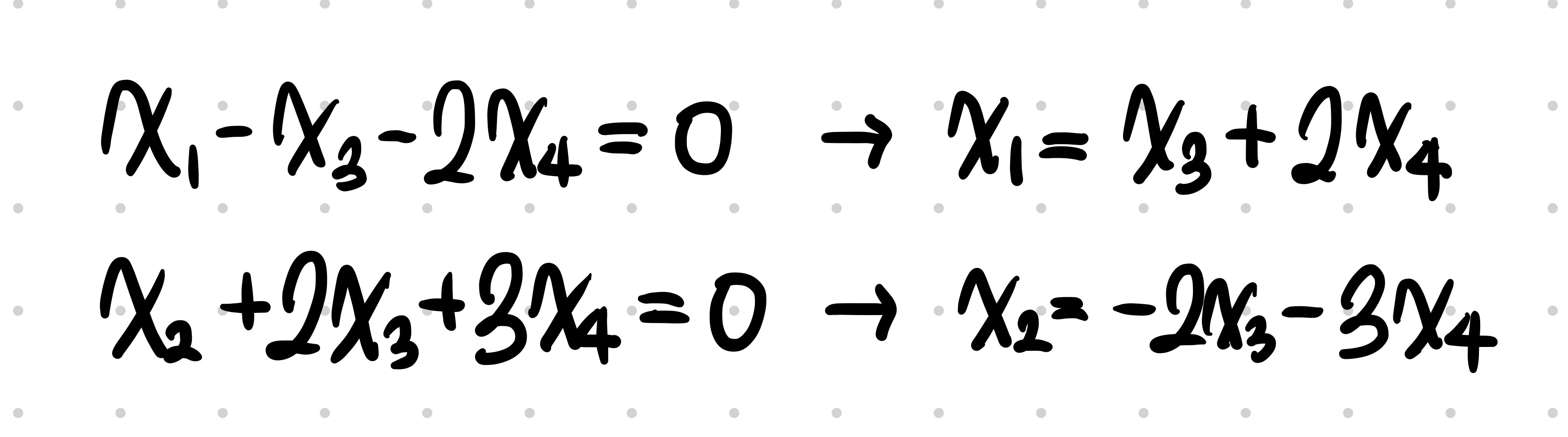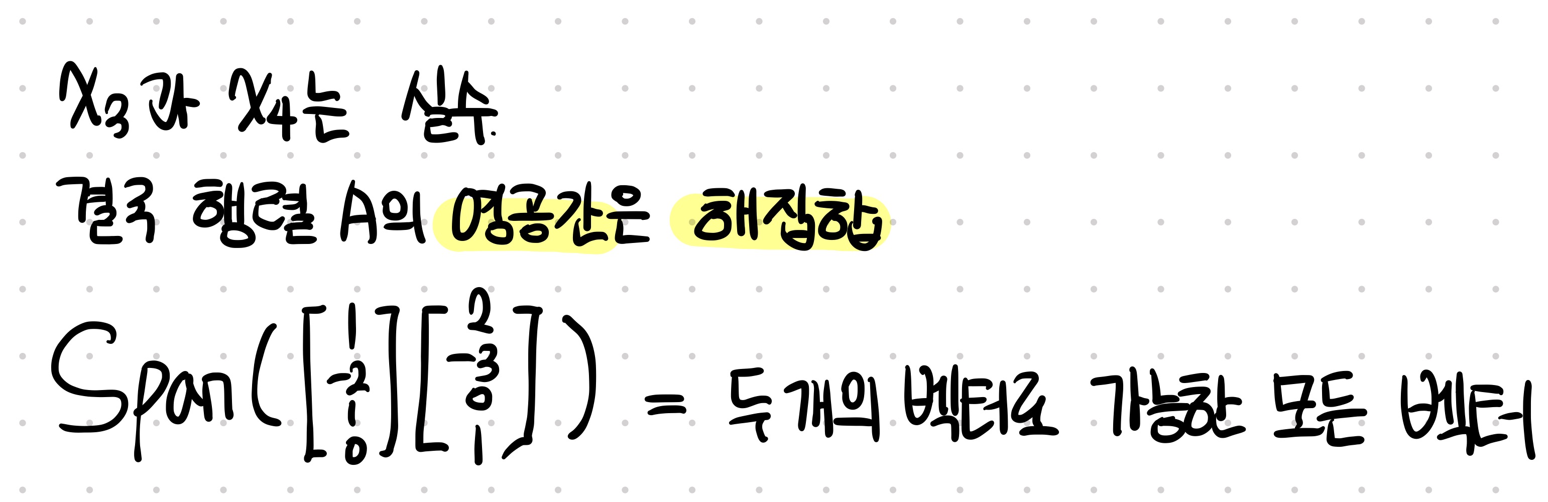 여기서 잠시! x3과 x4는 실수입니다. 어느 수든 실수라면 상관없습니다. 즉, x3과 x4에 따라 무수한 값이 나올 수 있으며 결국 영공간은 해집합이라는 것을 알 수 있습니다.